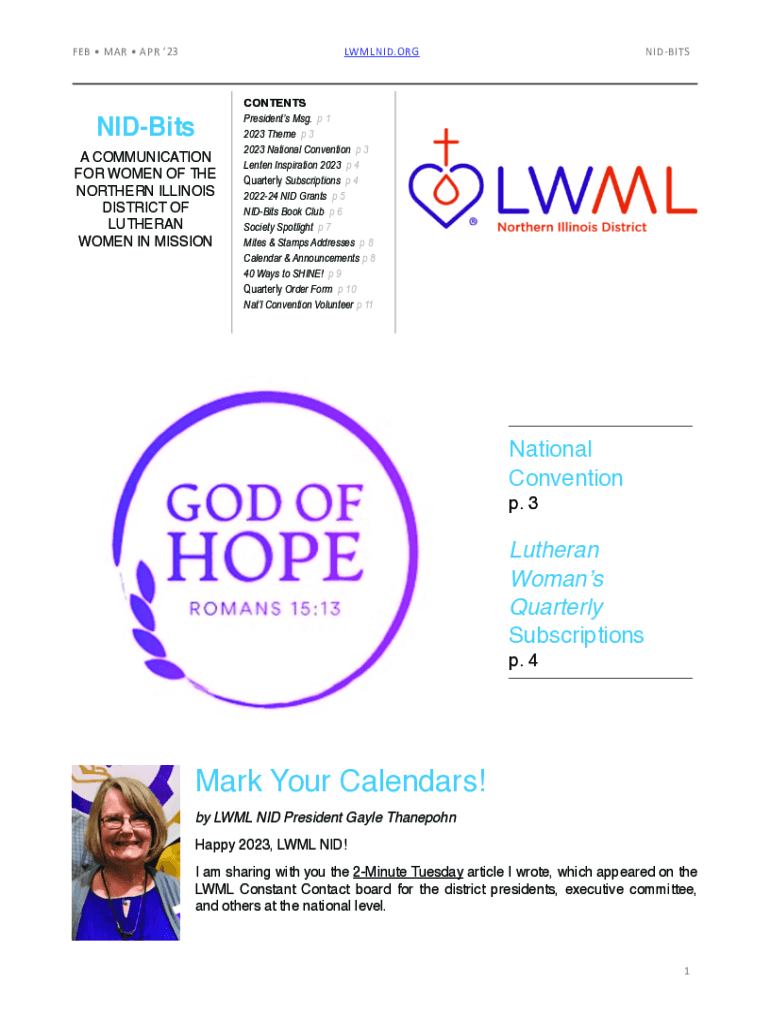 FEB MAR APR 23LWMLNID.ORGNIDBits A COMMUNICATION FOR WOMEN OF THE NORTHERN ILLINOIS DISTRICT OF LUTHERAN WOMEN IN MISSIONNIDBITSCONTENTS Presidents Msg. p 1 2023 Theme p 3 2023 National Convention