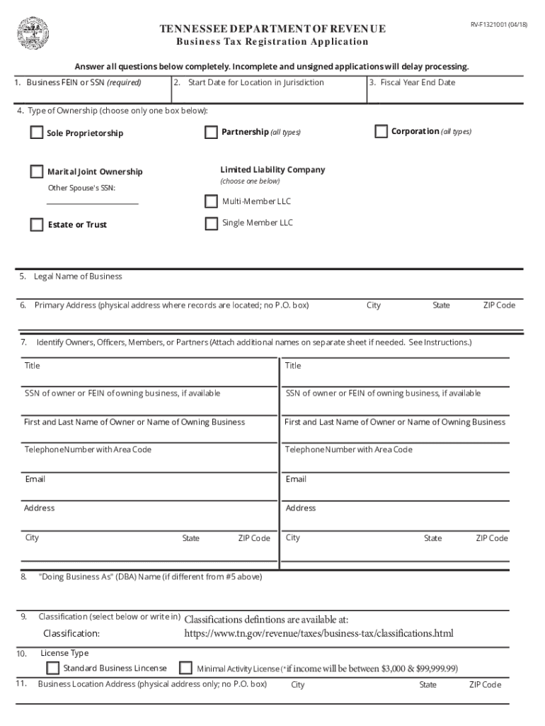 RVF1321001 (04/18)TENNESSEE DEPARTMENT OF REVENUE Business Tax Registration ApplicationAnswer all questions below completely. Incomplete and unsigned applications will delay processing. 1. Business
