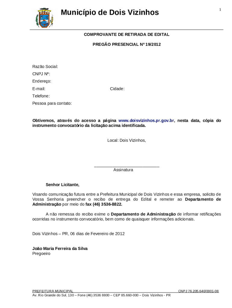 - Search for the Visando comunicao futura entre a Prefeitura Municipal de Dois Vizinhos e essa empresa, solicito de Vossa Senhoria preencher o recibo de entrega do Edital e remeter ao Departamento de Administrao por meio do fax (46) 3536-8822 form from the PDFfiller’s library.