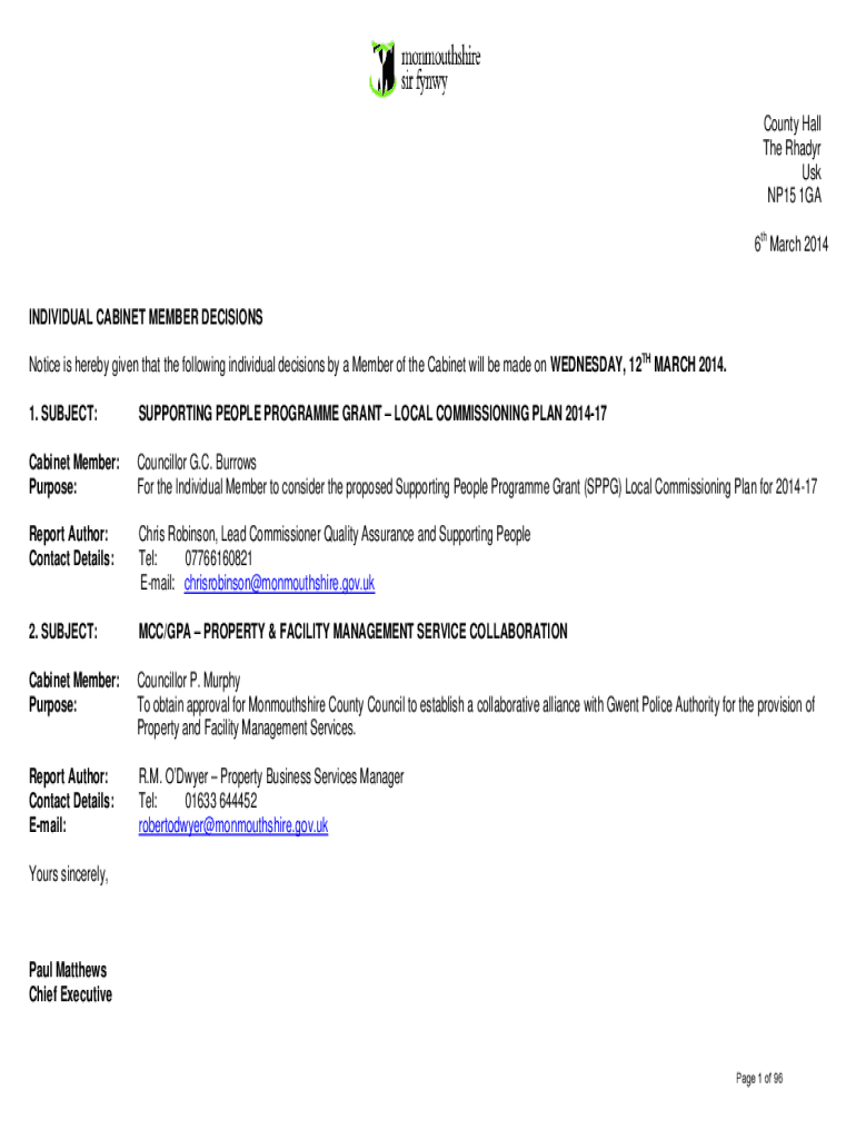 Get the free Notice of Individual Cabinet Member Decisions - 26th March ... - democracy monmouths...