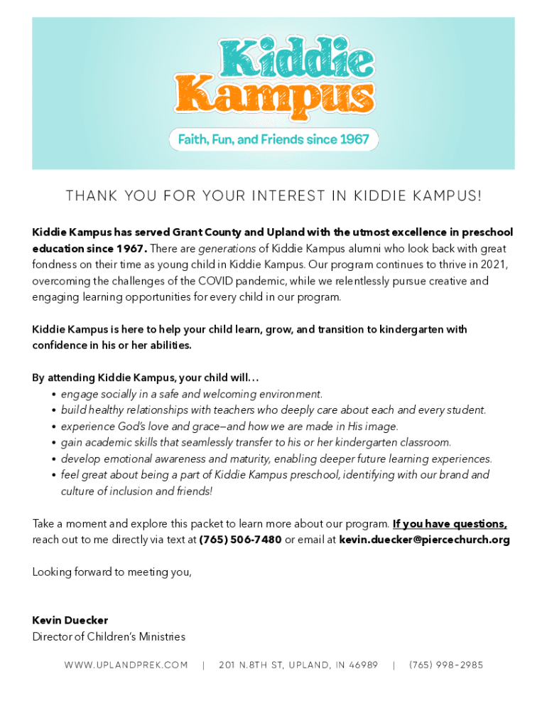 T H A N K YO U F O R YO You are I N T E R E ST I N K I D D I E K A M P U S ! Kiddie Campus has served Grant County and Upland with the utmost excellence in preschool education since 1967. There are