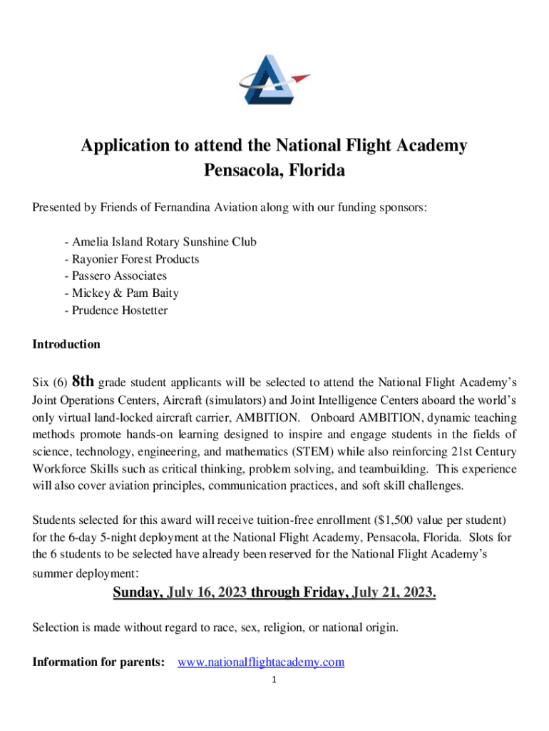 Application to attend the National Flight Academy Pensacola, Florida Presented by Friends of Fernandina Aviation along with our funding sponsors: Amelia Island Rotary Sunshine Club Rayonier Forest