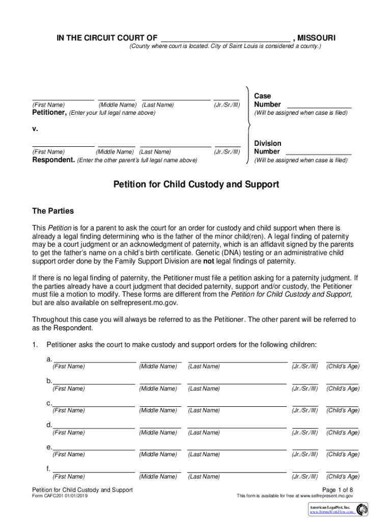 IN THE CIRCUIT COURT OF, MISSOURI(County where court is located. City of Saint Louis is considered a county.)(First Name)Petitioner, (Middle Name) (Last Name) (Enter your full legal name above)(Jr./Sr./III)Case