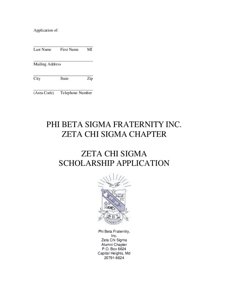 Application of:Last NameFirst NameMIMailing AddressCityStateZip(Area Code)Telephone NumberPHI BETA SIGMA FRATERNITY INC. ZETA CHI SIGMA CHAPTER ZETA CHI SIGMA SCHOLARSHIP APPLICATIONPhi Beta Fraternity,
