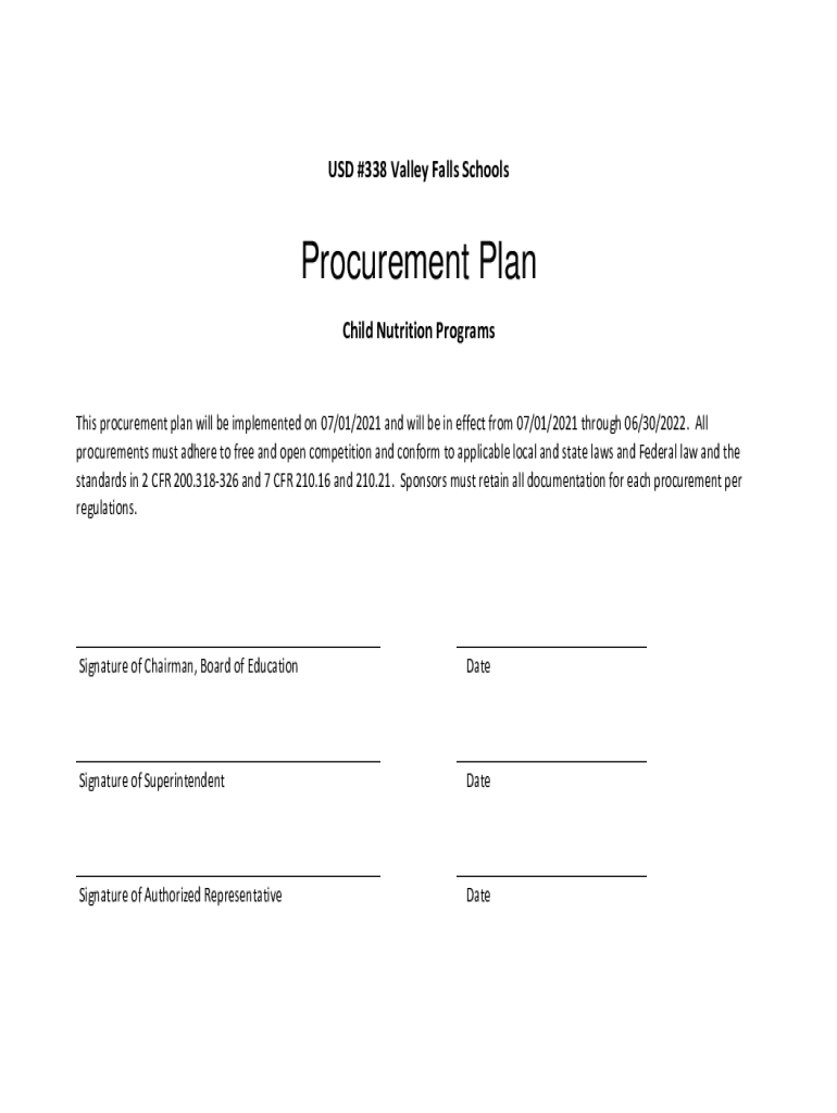 USD #338 Valley Falls SchoolsProcurement Plan Child Nutrition ProgramsThis procurement plan will be implemented on 07/01/2021 and will be in effect from 07/01/2021 through 06/30/2022. All procurements
