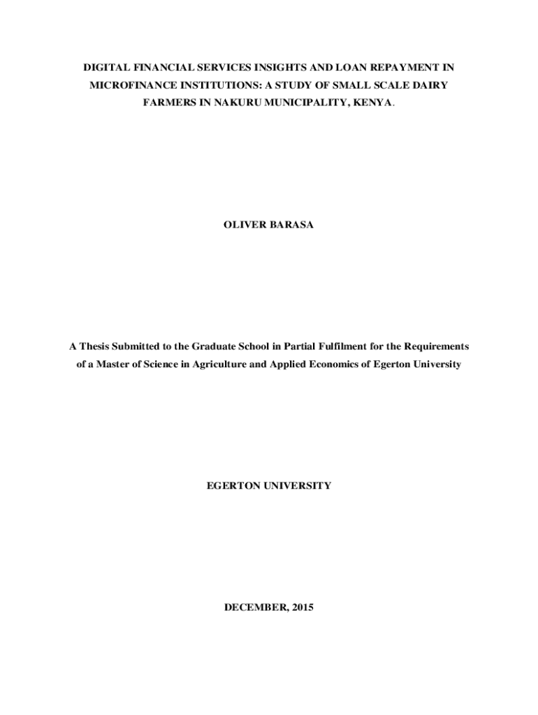 DIGITAL FINANCIAL SERVICES INSIGHTS AND LOAN REPAYMENT IN MICROFINANCE INSTITUTIONS: A STUDY OF SMALL SCALE DAIRY FARMERS IN NAKURU MUNICIPALITY, KENYA.OLIVER BARASAA Thesis Submitted to the Graduate