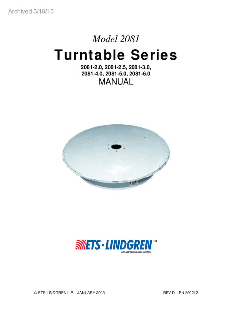 Archived 3/18/10Model 2081Turntable Series 20812.0, 20812.5, 20813.0, 20814.0, 20815.0, 20816.0MANUAL ETSLINDGREN L.P. JANUARY 2003REV D PN 399212Archived 3/18/10MODEL 2081 TURNTABLE SERIESETSLindgren