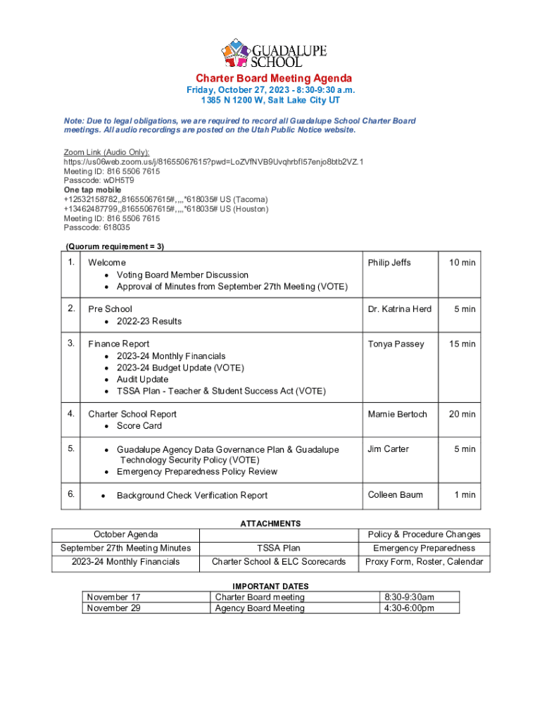 Charter Board Meeting AgendaFriday, October 27, 2023 8:309:30 a.m. 1385 N 1200 W, Salt Lake City UT Note: Due to legal obligations, we are required to record all Guadalupe School Charter Board meetings.