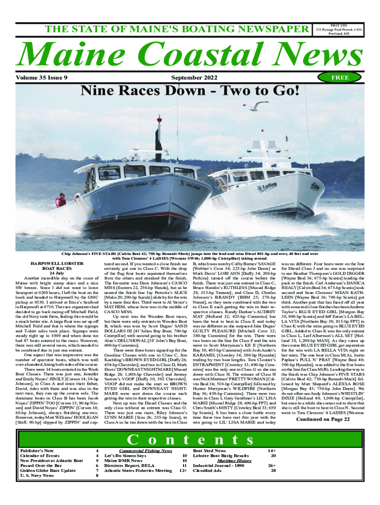 THE STATE OF MAINE\'S BOATING NEWSPAPERPRST STD US Postage Paid Permit, #454 Portland, MEMaine Coastal NewsVolume 35 Issue 9September 2022Nine Races Down Two to Go!FREEChip Johnsons FIVE STARS [Calvin