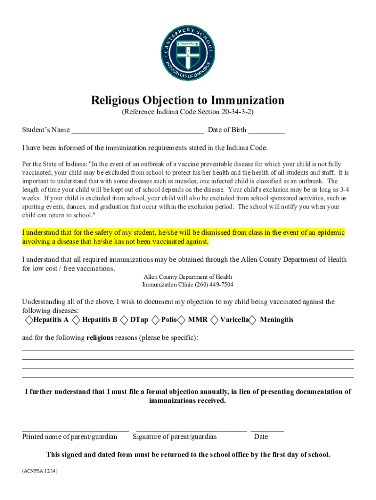 Religious Objection to Immunization (Reference Indiana Code Section 203432) Students Name ___ Date of Birth ___ I have been informed of the immunization requirements stated in the Indiana Code. Per
