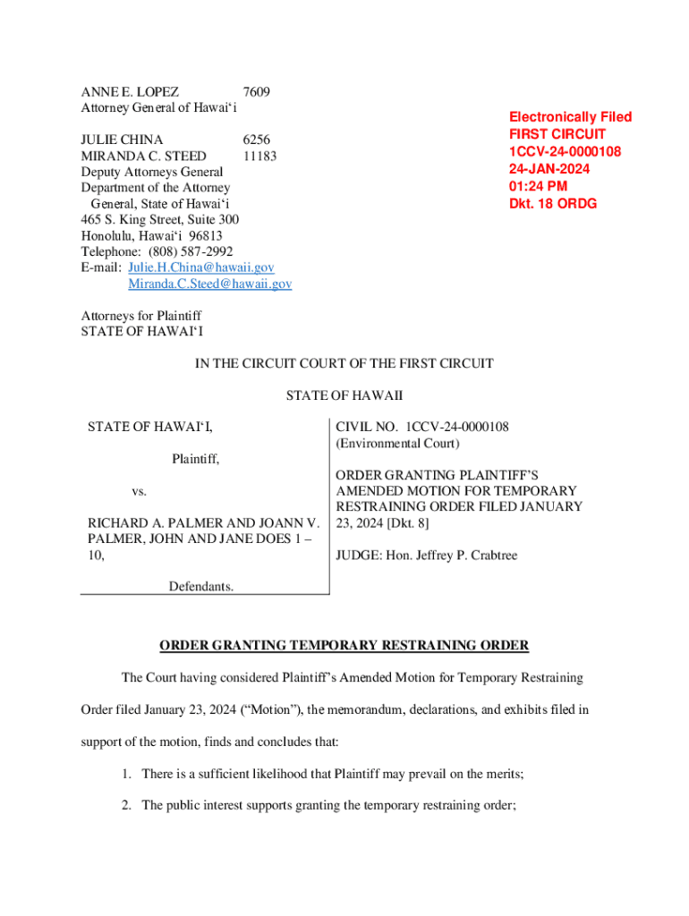 ANNE E. LOPEZ 7609 Attorney General of HawaiiElectronically Filed FIRST CIRCUIT 1CCV240000108 24JAN2024 01:24 PM Dkt. 18 ORDGJULIE CHINA 6256 MIRANDA C. STEED 11183 Deputy Attorneys General Department