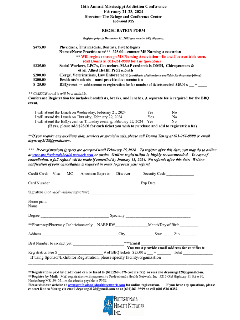 16th Annual Mississippi Addiction Conference February 2123, 2024 Sheraton The Refuge and Conference Center Flowood MS REGISTRATION FORM Register prior to December 31, 2023 and receive 10% discount.$475.00$325.00