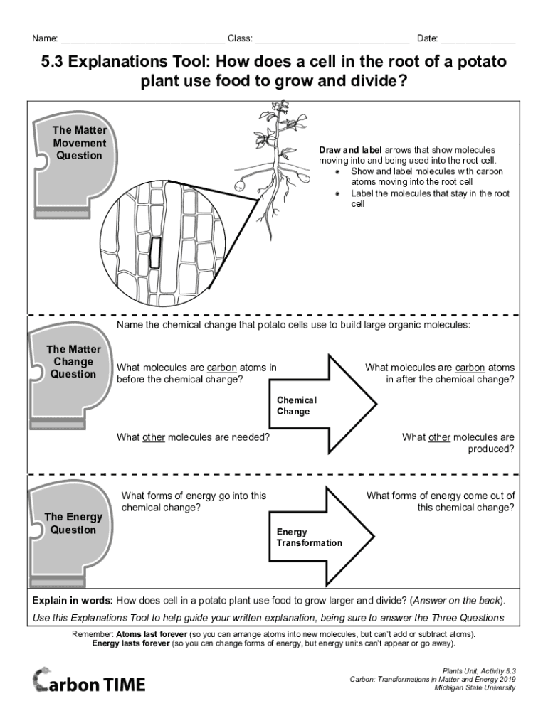 Name: ___ Class: ___ Date: ___5.3 Explanations Tool: How does a cell in the root of a potato plant use food to grow and divide? The Matter Movement QuestionDraw and label arrows that show molecules