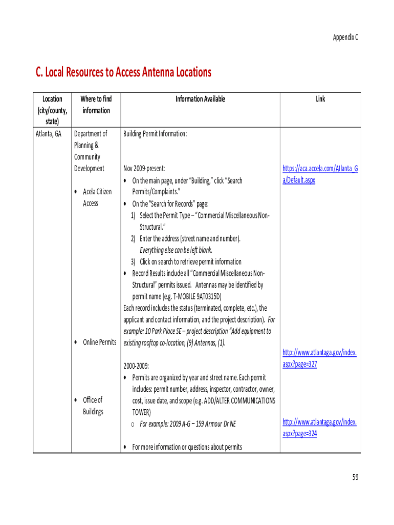 Appendix CC. Local Resources to Access Antenna Locations Location (city/county, state) Atlanta, GAWhere to find information Department of Planning & Community Development Acela Citizen AccessOnline