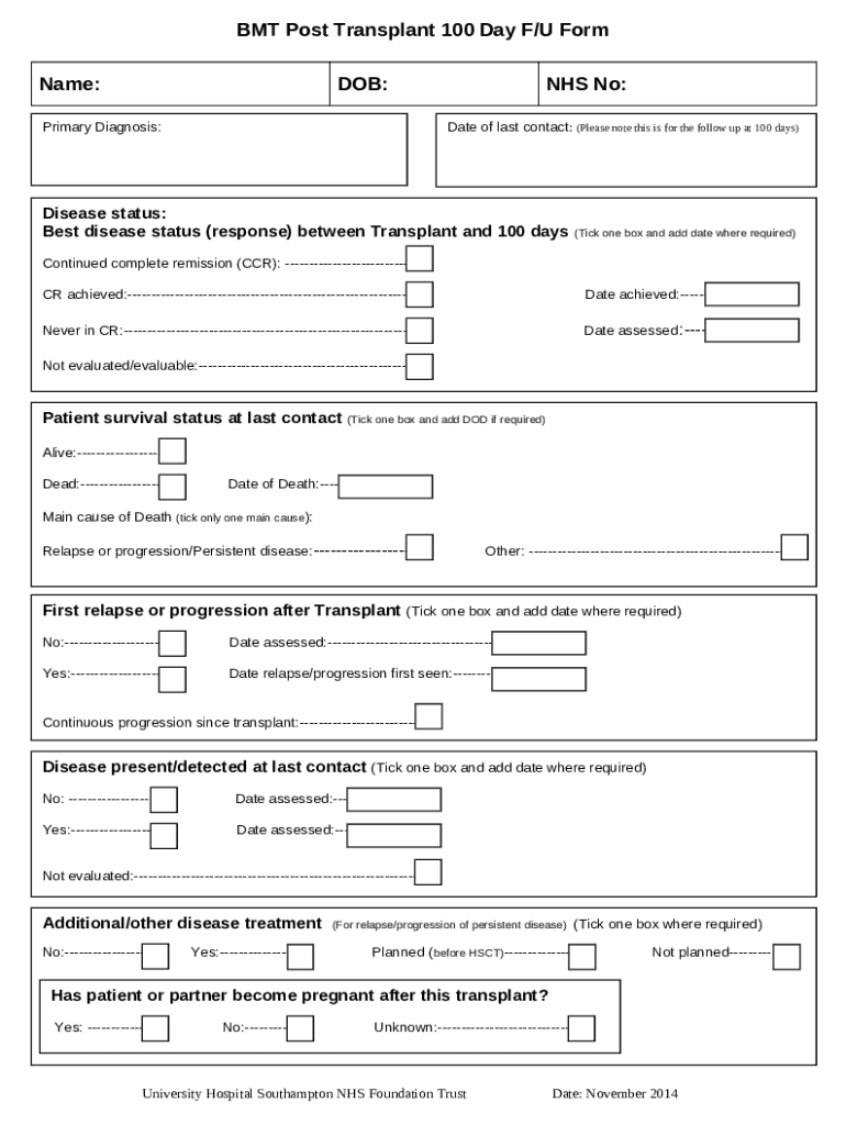 The 100 day post transplant follow-up is a Word document required to be submitted to the required address to provide certain information. It has to be completed and signed, which is possible manually, or with a certain software such as PDFfiller. This tool lets you complete any PDF or Word document directly in your browser, customize it according to your needs and put a legally-binding electronic signature. Right away after completion, the user can easily send the 100 day post transplant follow-up to the relevant receiver, or multiple recipients via email or fax. The editable template is printable as well due to PDFfiller feature and options presented for printing out adjustment. Both in digital and physical appearance, your form will have got organized and professional look. You can also save it as the template for later, without creating a new document from scratch. Just edit the ready template.