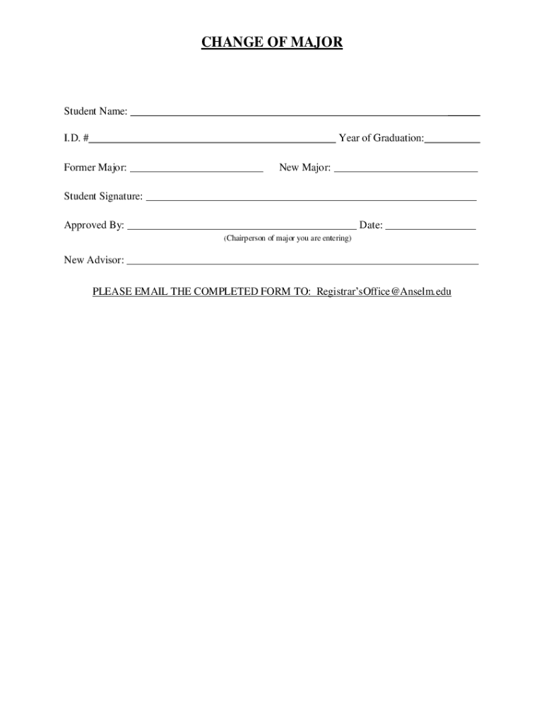 CHANGE OF MAJORStudent Name:___I.D. #Year of Graduation:Former Major: ___New Major: ___Student Signature: ___ Approved By: ___ Date: ___ (Chairperson of major you are entering)New Advisor: ___ PLEASE