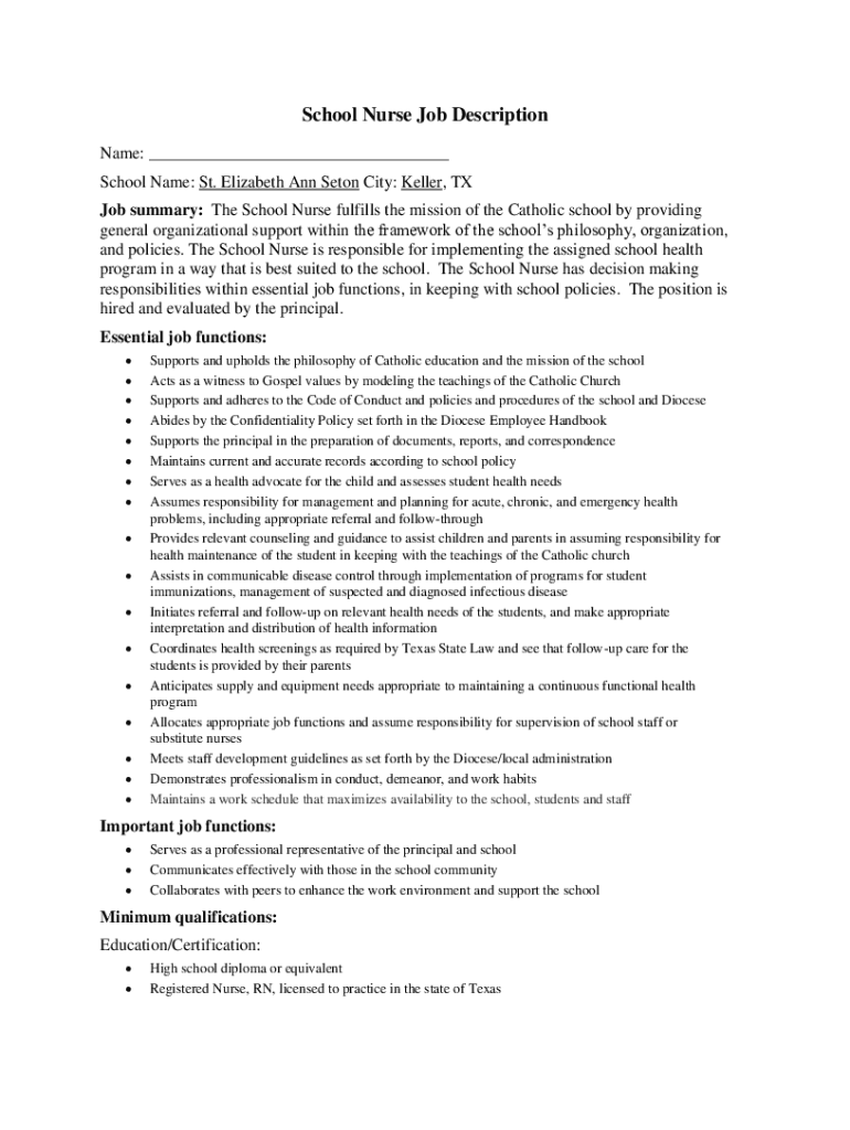 Job summary: The School Nurse fulfills the mission of the Catholic school by providing