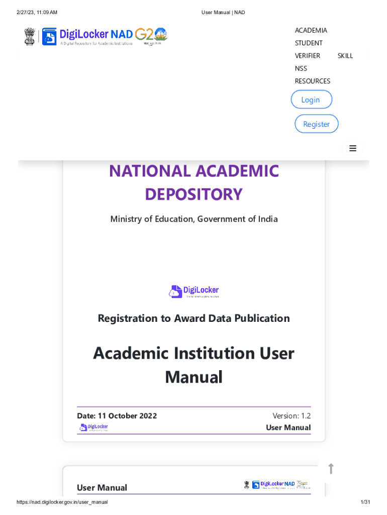 2/27/23, 11:09 AMUser Manual | NADACADEMIA STUDENT VERIFIERSKILLNSS RESOURCESLogin User ManualRegister NATIONAL ACADEMIC DEPOSITORY Ministry of Education, Government of IndiaRegistration to Award