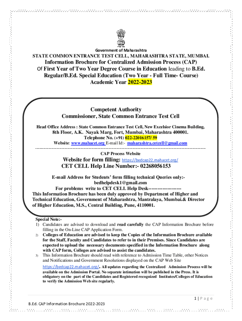 Government of MaharashtraSTATE COMMON ENTRANCE TEST CELL, MAHARASHTRA STATE, MUMBAI.Information Brochure for Centralized Admission Process (CAP) Of First Year of Two Year Degree Course in Education