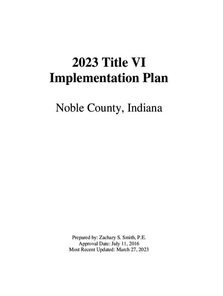 2023 Title VI Implementation Plan Noble County, IndianaPrepared by: Zachary S. Smith, P.E. Approval Date: July 11, 2016 Most Recent Updated: March 27, 2023Table of Contents Title VI Implementation