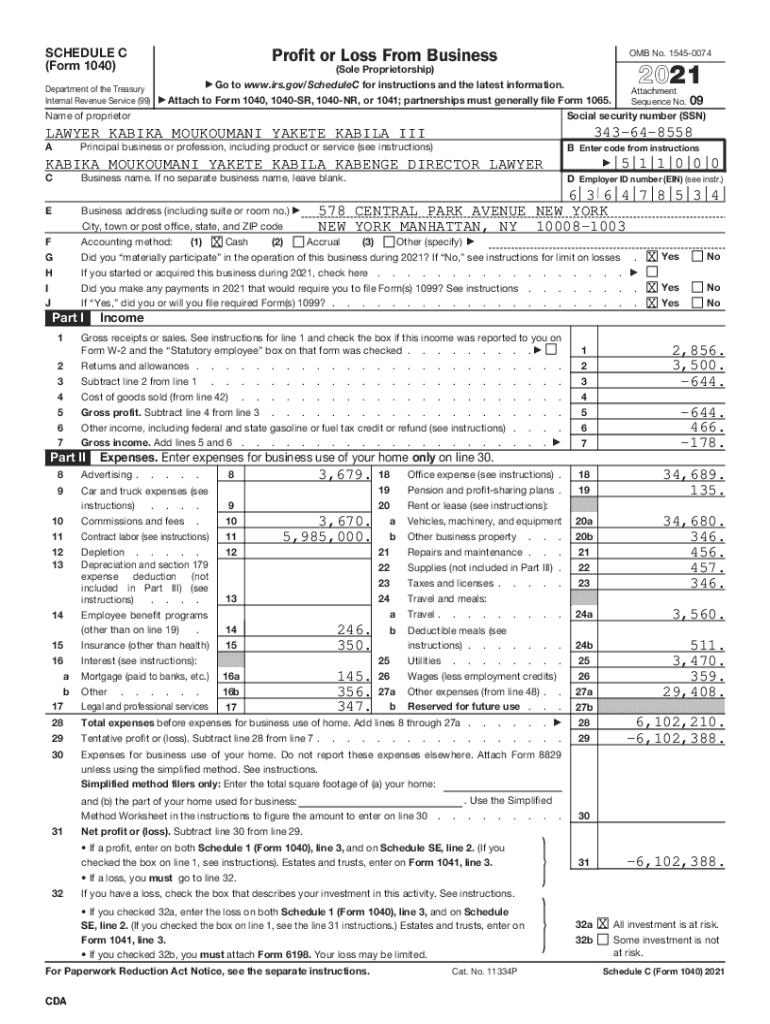 Profit or Loss From BusinessSCHEDULE C (Form 1040) a GoOMB No. 154500742021(Sole Proprietorship) to www.irs.gov/ScheduleC for instructions and the latest information.Department of the Treasury Internal