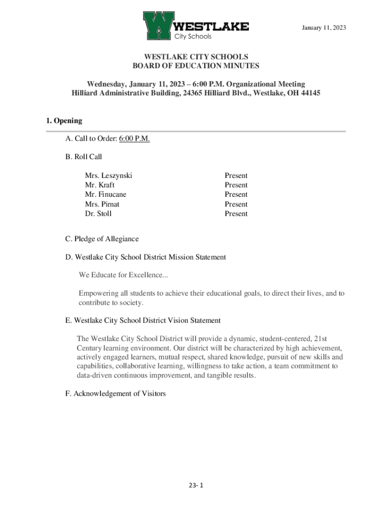 January 11, 2023WESTLAKE CITY SCHOOLS BOARD OF EDUCATION MINUTES Wednesday, January 11, 2023 6:00 P.M. Organizational Meeting Hilliard Administrative Building, 24365 Hilliard Blvd., Westlake, OH 441451.