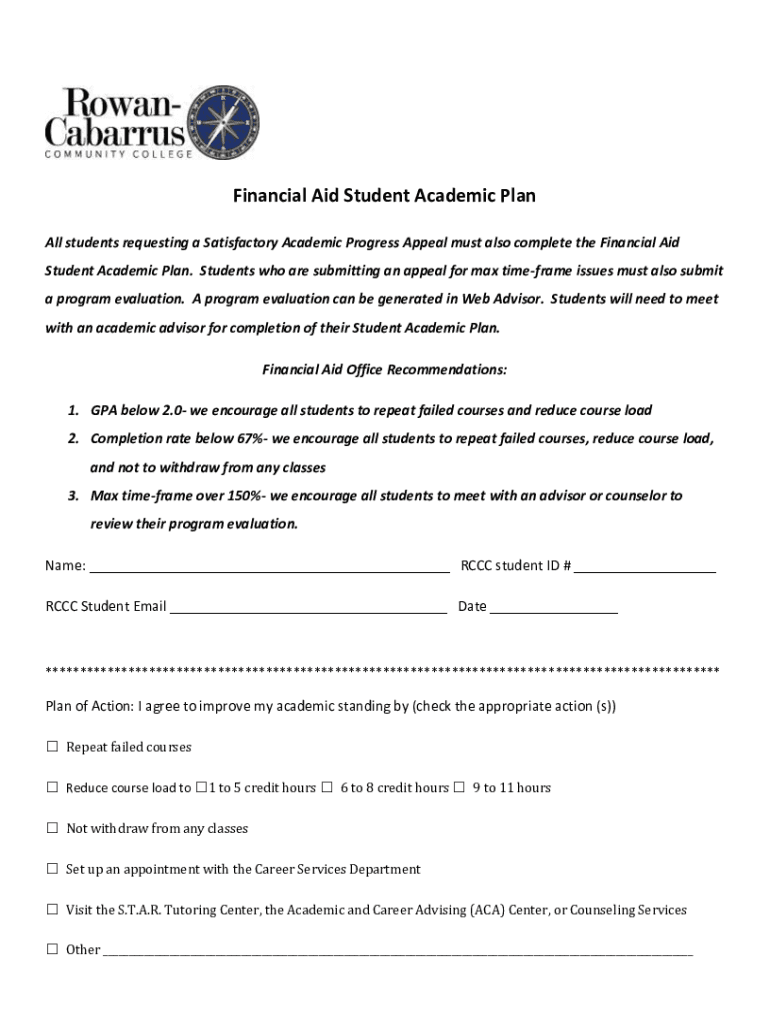 Financial Aid Student Academic Plan All students requesting a Satisfactory Academic Progress Appeal must also complete the Financial Aid Student Academic Plan. Students who are submitting an appeal