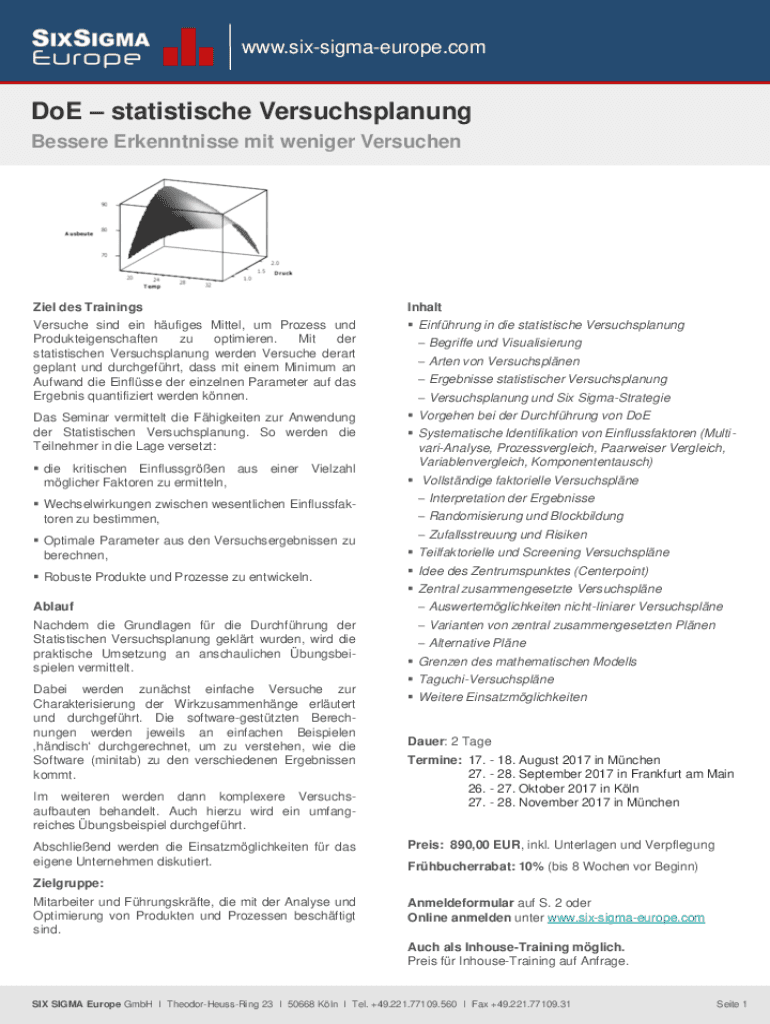 www.sixsigmaeurope.comDoE statistische Versuchsplanung Bessere Erkenntnisse mit weniger VersuchenZiel des TrainingsInhaltVersuche sind ein hufiges Mittel, um Prozess und Produkteigenschaften zu optimieren.