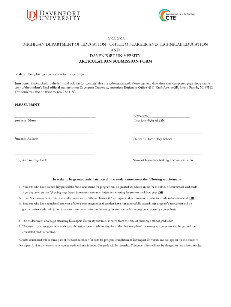 20222023 MICHIGAN DEPARTMENT OF EDUCATION OFFICE OF CAREER AND TECHNICAL EDUCATION AND DAVENPORT UNIVERSITY ARTICULATION SUBMISSION FORM Student: Complete your personal information below. Instructor: