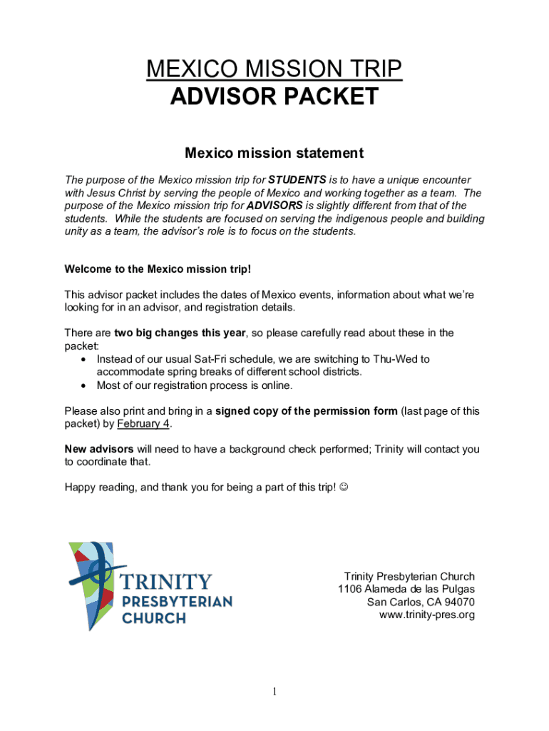 MEXICO MISSION TRIP ADVISOR PACKET Mexico mission statement The purpose of the Mexico mission trip for STUDENTS is to have a unique encounter with Jesus Christ by serving the people of Mexico and