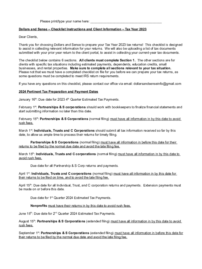 Please print/type your name here: ___ Dollars and Sense Checklist Instructions and Client Information Tax Year 2023 Dear Clients, Thank you for choosing Dollars and Sense to prepare your Tax Year