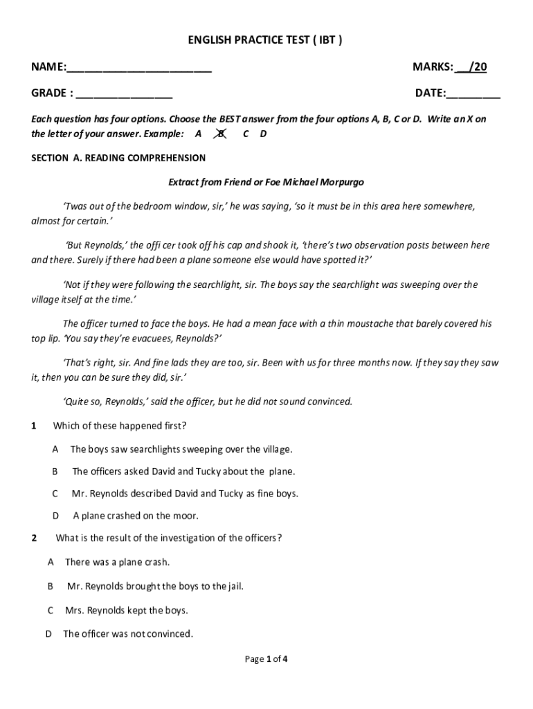 NAME:___MARKS: __/20GRADE : ___DATE:___Each question has four options. Choose the BEST answer from the four options A, B, C or D. Write an X on