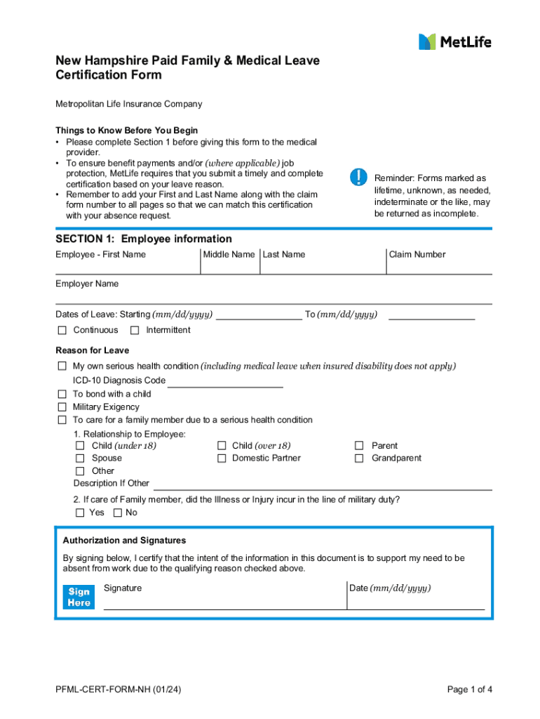 DxNew Hampshire Paid Family & Medical Leave Certification Form Metropolitan Life Insurance Company Things to Know Before You Begin Please complete Section 1 before giving this form to the medical
