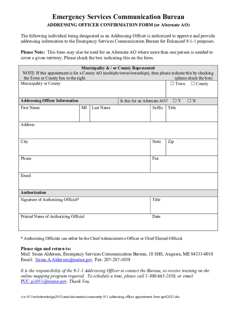 Emergency Services Communication Bureau ADDRESSING OFFICER CONFIRMATION FORM (or Alternate AO) The following individual being designated as an Addressing Officer is authorized to approve and provide