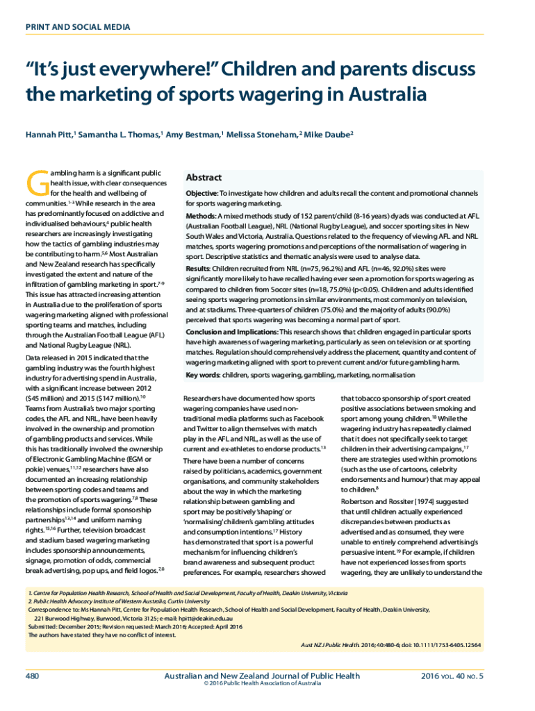 Print and Social Mediate just everywhere! Children and parents discuss the marketing of sports wagering in Australia Hannah Pitt,1 Samantha L. Thomas,1 Amy Best man,1 Melissa Stone ham,2 Mike Daube2Gambling