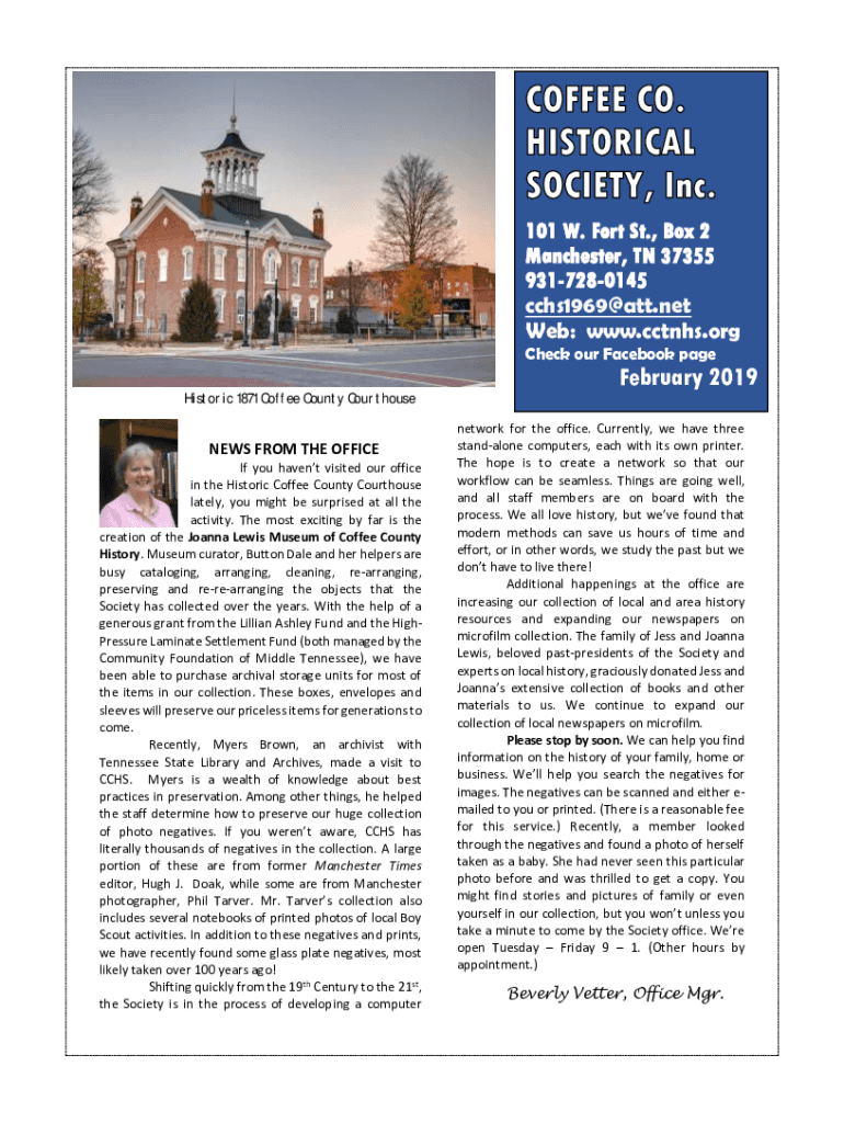 101 W. Fort St., Box 2 Manchester, TN 37355 9317280145 cchs1969@att.net Web: www.cctnhs.org Check our Facebook pageFebruary 2019 Historic 1871 Coffee County CourthouseNEWS FROM THE OFFICE If you havent