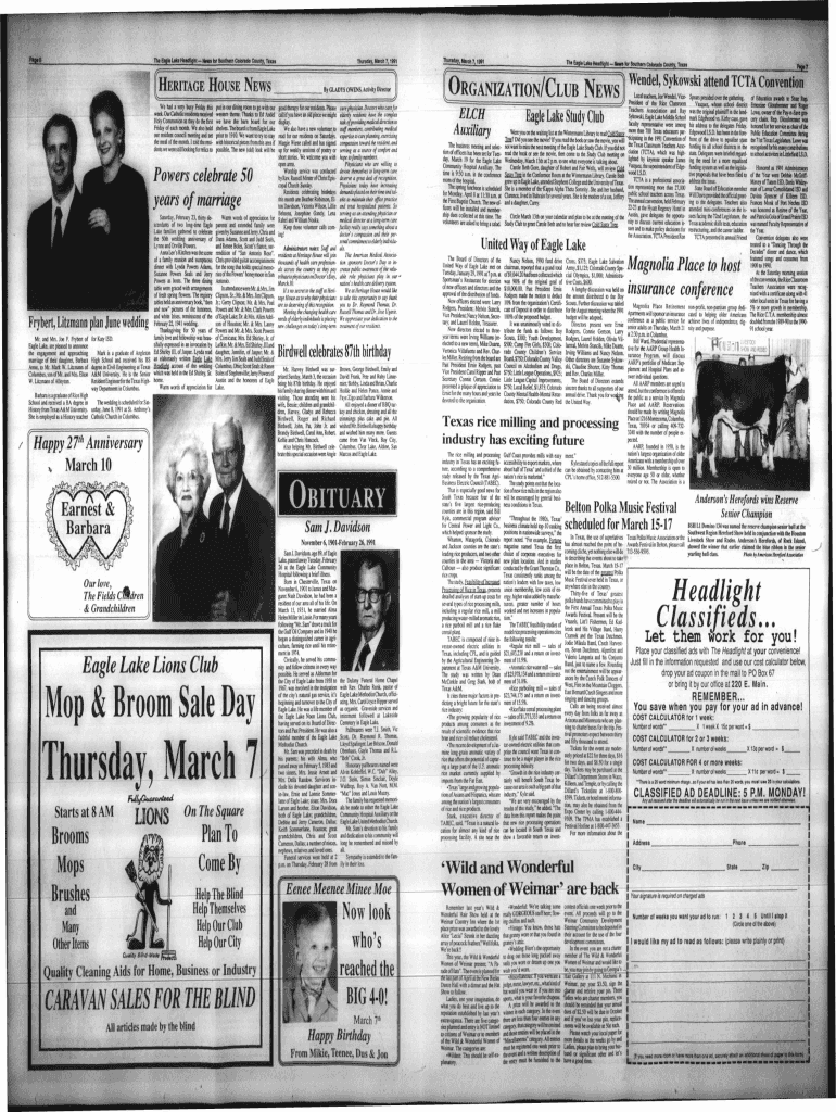 Barrett \'^ \”V i t IJ V 1 ^ \'?PQS^PfiilPI^ ^ PTH East Lies Headlight HvtntorSouthTn Colorado County, Thursday, March 7,1991Thursday. March 7.1991