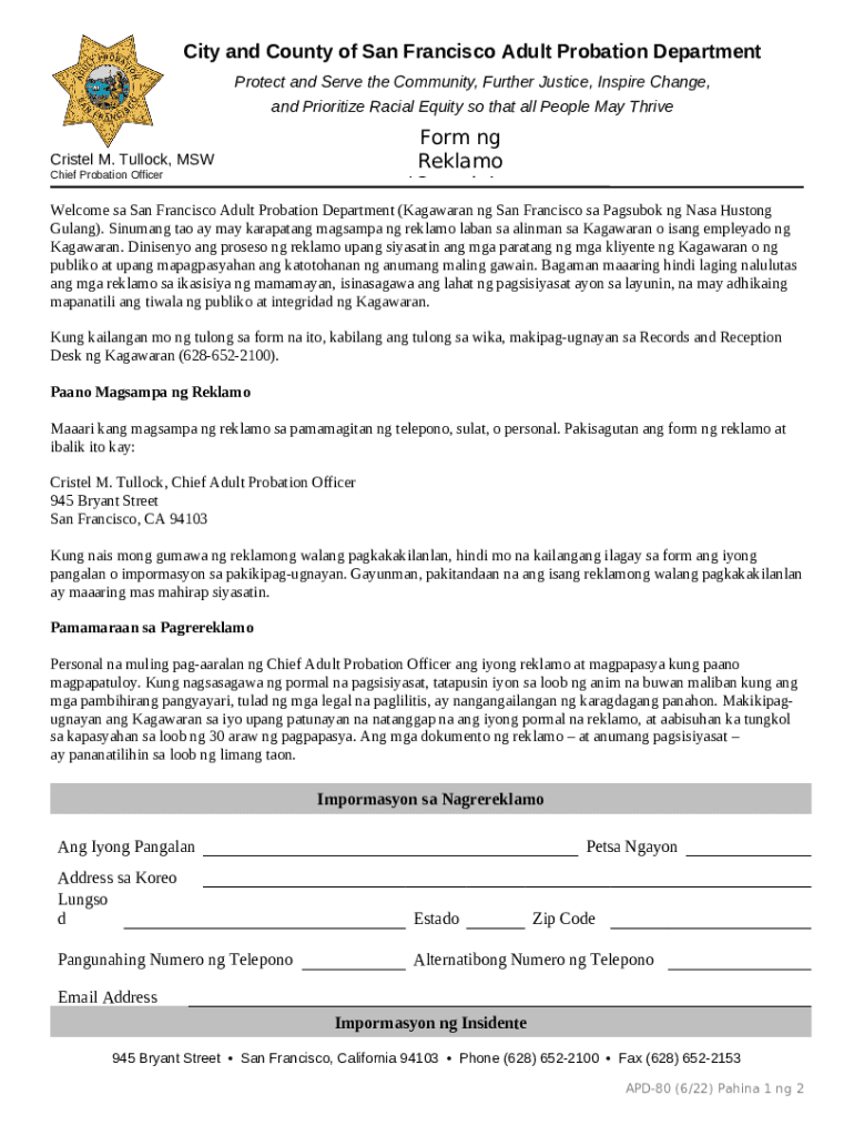 The San Francisco Adult Probation Department Letterhead is a document you can get completed and signed for specific purpose. Next, it is furnished to the actual addressee to provide specific info of any kinds. The completion and signing is available manually or via a suitable tool like PDFfiller. These applications help to fill out any PDF or Word file online. It also lets you edit its appearance according to the needs you have and put legit electronic signature. Once you're good, the user ought to send the San Francisco Adult Probation Department Letterhead to the recipient or several of them by email and also fax. PDFfiller offers a feature and options that make your blank printable. It includes a number of settings for printing out. It does no matter how you'll distribute a document - in hard copy or electronically - it will always look professional and firm. In order not to create a new writable document from scratch all the time, turn the original file into a template. Later, you will have an editable sample.