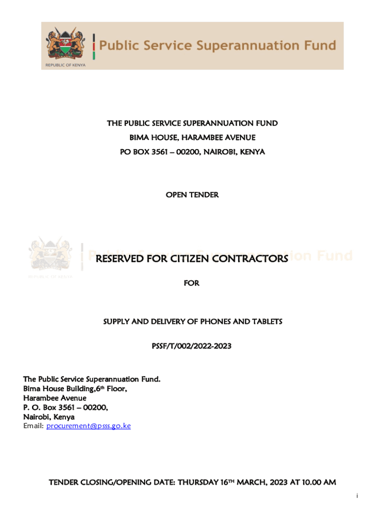 THE PUBLIC SERVICE SUPERANNUATION FUND BIMA HOUSE, HARAMBEE AVENUE PO BOX 3561 00200, NAIROBI, KENYAOPEN TENDERRESERVED FOR CITIZEN CONTRACTORS FORSUPPLY AND DELIVERY OF PHONES AND TABLETS PSSF/T/002/20222023The