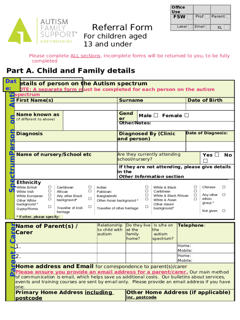 The Referral for children under 13 is a document you can get completed and signed for certain purpose. Next, it is furnished to the exact addressee in order to provide specific details of certain kinds. The completion and signing is possible manually in hard copy or with a suitable service e. g. PDFfiller. Such tools help to send in any PDF or Word file without printing out. It also allows you to edit its appearance depending on your requirements and put a legal electronic signature. Once done, the user ought to send the Referral for children under 13 to the respective recipient or several ones by mail and even fax. PDFfiller provides a feature and options that make your Word template printable. It provides various settings when printing out appearance. No matter, how you'll deliver a document - in hard copy or electronically - it will always look well-designed and firm. In order not to create a new editable template from the beginning over and over, make the original file as a template. Later, you will have an editable sample.