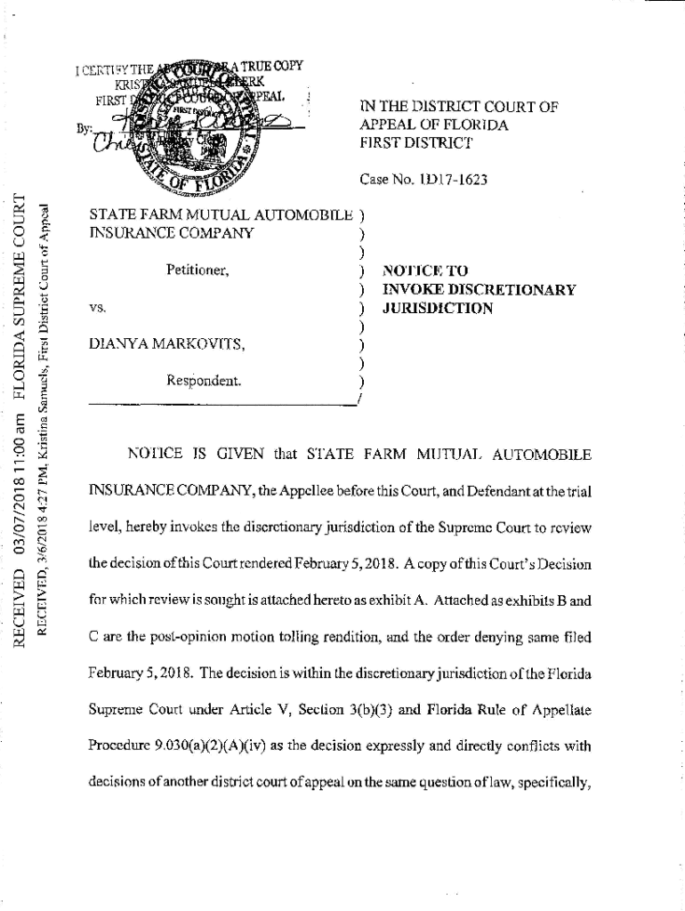 I CERTIFY TH KRITRUE COW RKFIRSTIN THE DISTRICT COURT OF APPEAL OF FLORIDA FIRST DISTRICTBy:Case No. 1D171623 STATE FARM MUTUAL AUTOMOBILE ) INSURANCE COMPANY ) Petitioner, vs.) ) )DIANYA MARKOVITS,)Respondent.)NOTICE