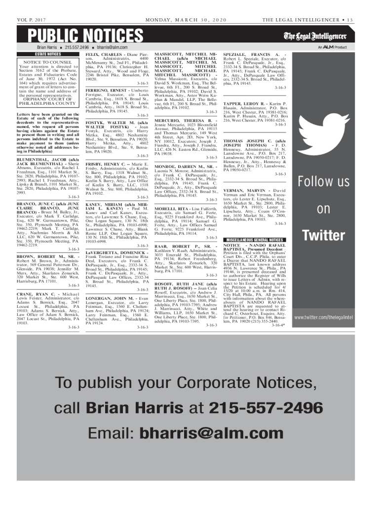 VOL P. 2017MON DAY, M A R C H 3 0 , 2 0 2 0THE LEGAL INTELLIGENCER 13PUBLIC NOTICES #SJBO)BSSJT215.557.2ESTATE NOTICESNOTICE TO COUNSEL Your attention is directed to Section 3162 of the Probate, Estates