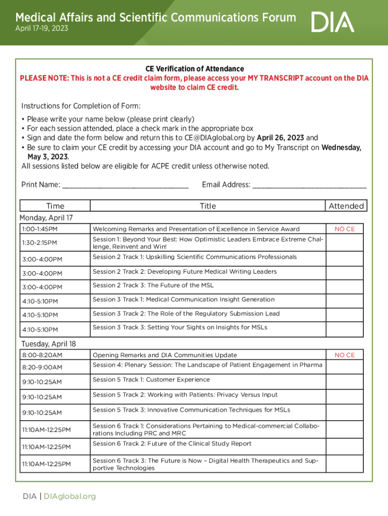 Medical Affairs andIndustry Scientificand Communications Forum DIA Biostatistics Regulator Forum April 1719, 2023 May 2729, 2020 Virtual EventCE Verification of Attendance PLEASE NOTE: This is not