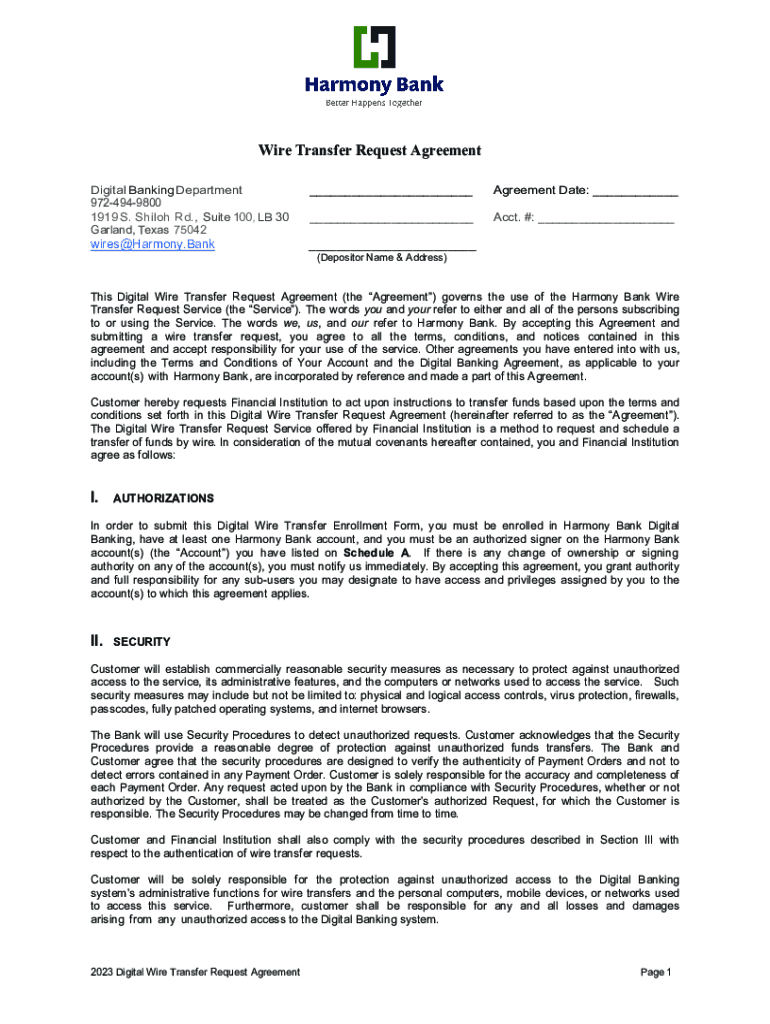 Wire Transfer Request Agreement Digital Banking Department 9724949800 1919 S. Shiloh Rd., Suite 100, LB 30 Garland, Texas 75042wires@Harmony.Bank___Agreement Date: ______Acct. #: ______ (Depositor