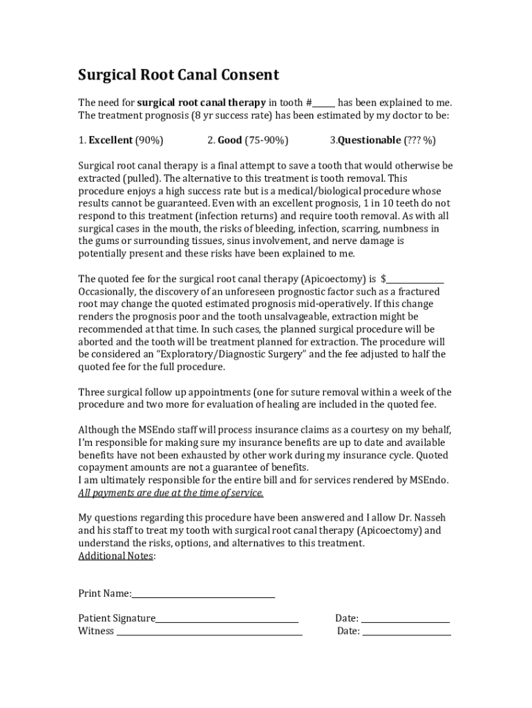 SurgicalRootCanalConsent Theneedforsurgicalrootcanaltherapyintooth#___hasbeenexplainedtome. Thetreatmentprognosis(8yrsuccessrate)hasbeenestimatedbymydoctortobe: 1.Excellent(90%)2.Good(7590%)