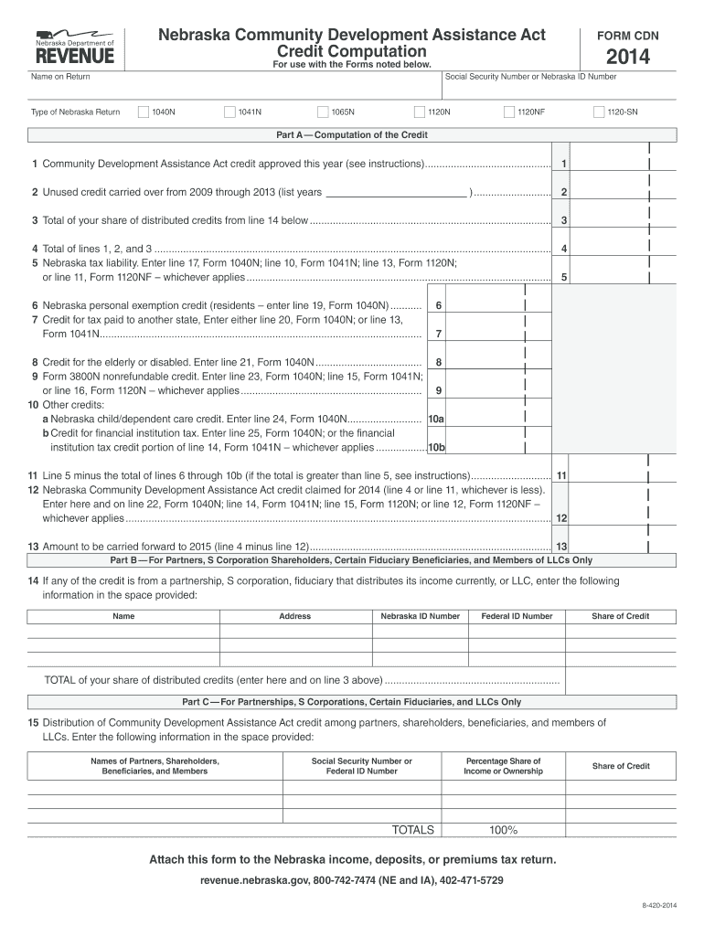 PRINT RESET Nebraska Community Development Assistance Act Credit Computation FORM CDN 2014 For use with the Forms noted below. Name on Return Social Security Number or Nebraska ID Number Type of Nebraska