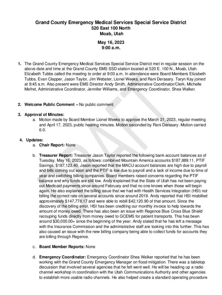 Grand County Emergency Medical Services Special Service District 520 East 100 North Moab, Utah May 16, 2023 9:00 a.m.1. The Grand County Emergency Medical Services Special Service District met in