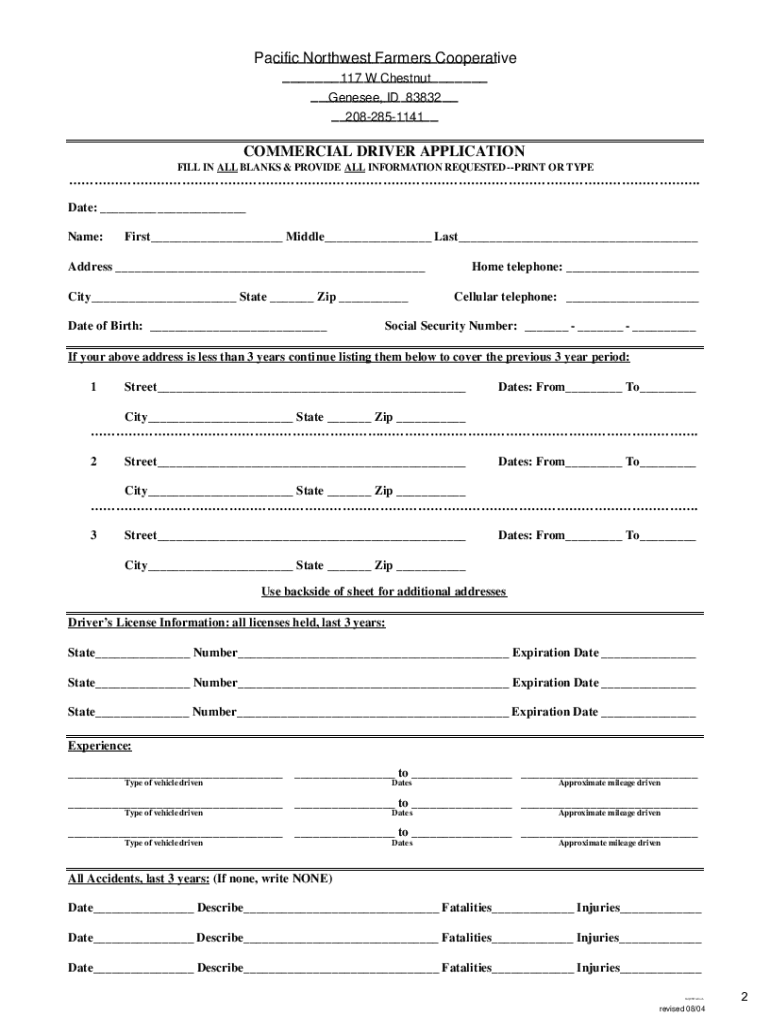 Get the free COMMERCIAL DRIVER APPLICATION Pacific Northwest ...