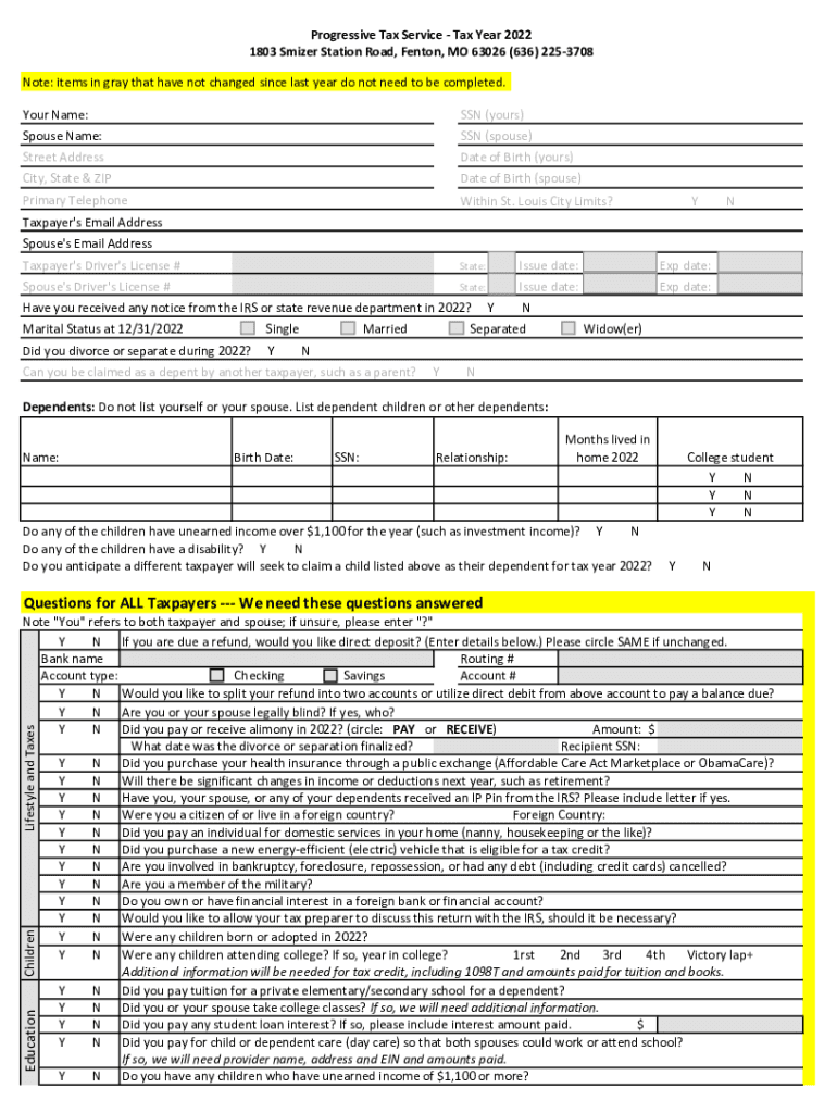 Progressive Tax Service Tax Year 2022 1803 Smizer Station Road, Fenton, MO 63026 (636) 2253708 Note: items in gray that have not changed since last year do not need to be completed. Your Name:SSN