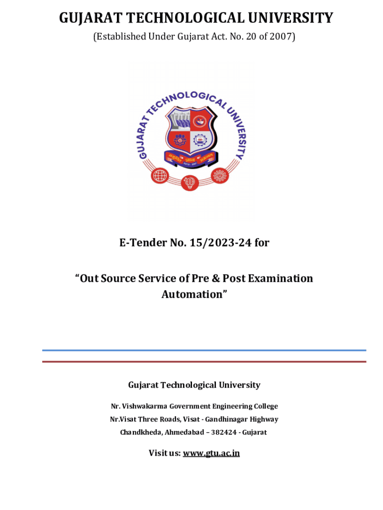 GUJARAT TECHNOLOGICAL UNIVERSITY (Established Under Gujarat Act. No. 20 of 2007)ETender No. 15/202324 for Out Source Service of Pre & Post Examination AutomationGujarat Technological University Nr.